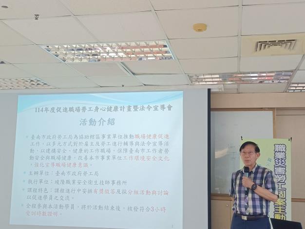 下午由竣隆職業安全衛生技師事務所鄭世岳技師所帶領的團隊提供服務,授課內容以勞工健康保護四大計畫為主,分別為:人因性危害預防、異常工作負荷促發疾病預防、執行職務遭受不法侵害預防以及母性健康保護…等計畫,課堂上鄭技師引述案例及相關法規如:職業安全衛生設施規則第324-1條,雇主使勞工從事重複性之作業,為避免勞工因姿勢不良、過度施力及作業頻率過高等原因,促發肌肉骨骼疾病,應採取下列危害預防措施,作成執行紀錄並留存三年:一.分析作業流程、內容及動作。二.確認人因性危害因子。三.評估、選定改善方法及執行…等,並藉由實際互動與解說提升事業單位預防危害的意識。
