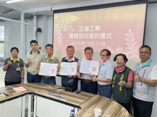 為穩定和諧勞資關係,共同營造幸福職場,正道工業股份有限公司工會與正道工業股份有限公司歷經多次理性協商與充分溝通,雙方於今(23)日成功達成團體協約之續約,簽約儀式由勞工局王鑫基局長、大台南總工會陳美靜副理事長及台南市產業總工會方子明副理事長共同見證。
