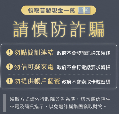 行政院「全民普發現金1萬元」勞工局提醒市民朋友登記及發放,需小心求證,以防詐騙受害!