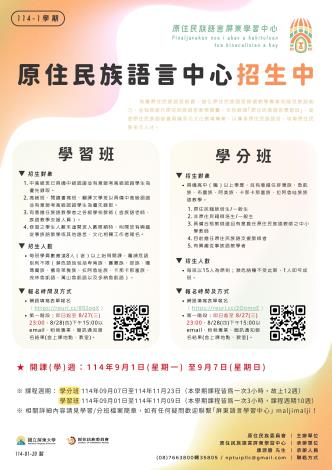 國立屏東大學辦理「原住民族語言屏東學習中心114學年第1學期原住民族語言學分班、學習班」招生簡章,請族語教師、族語學習者踴躍參與。