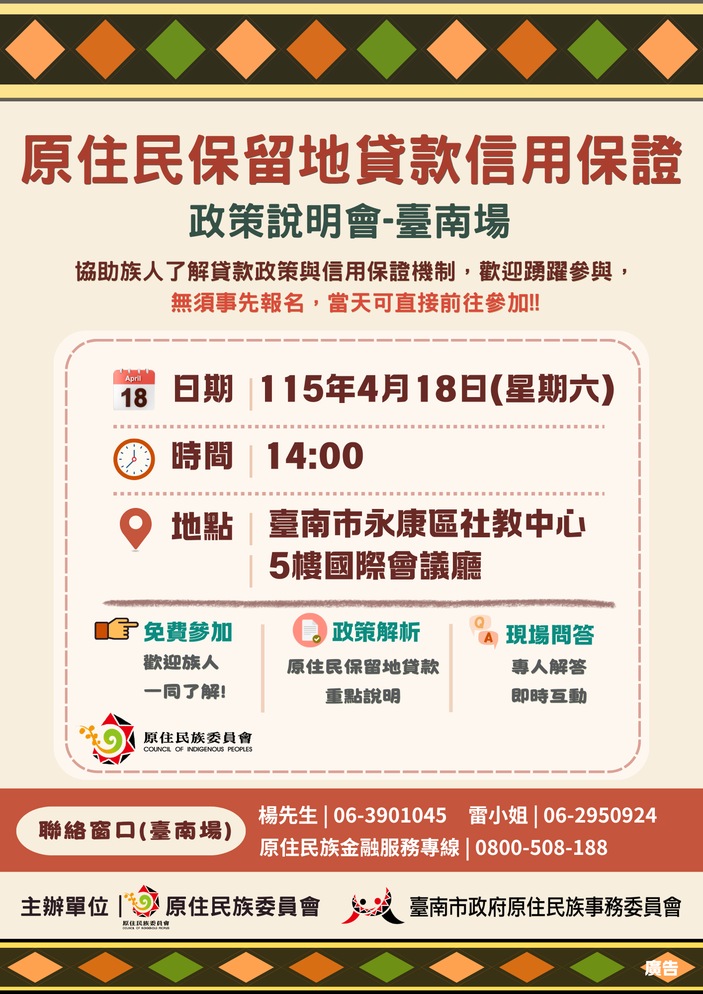 📣 原住民保留地貸款信用保證|臺南場說明會 👉 歡迎族人朋友一起來了解,把握貸款資源! 📅 4月18日(星期六)14:00 📍 永康社教中心5樓國際會議廳 ✨ 無須報名,免費參加,當天直接前往即可! ☎️ 0800-508-188(原住民金融服務專線)