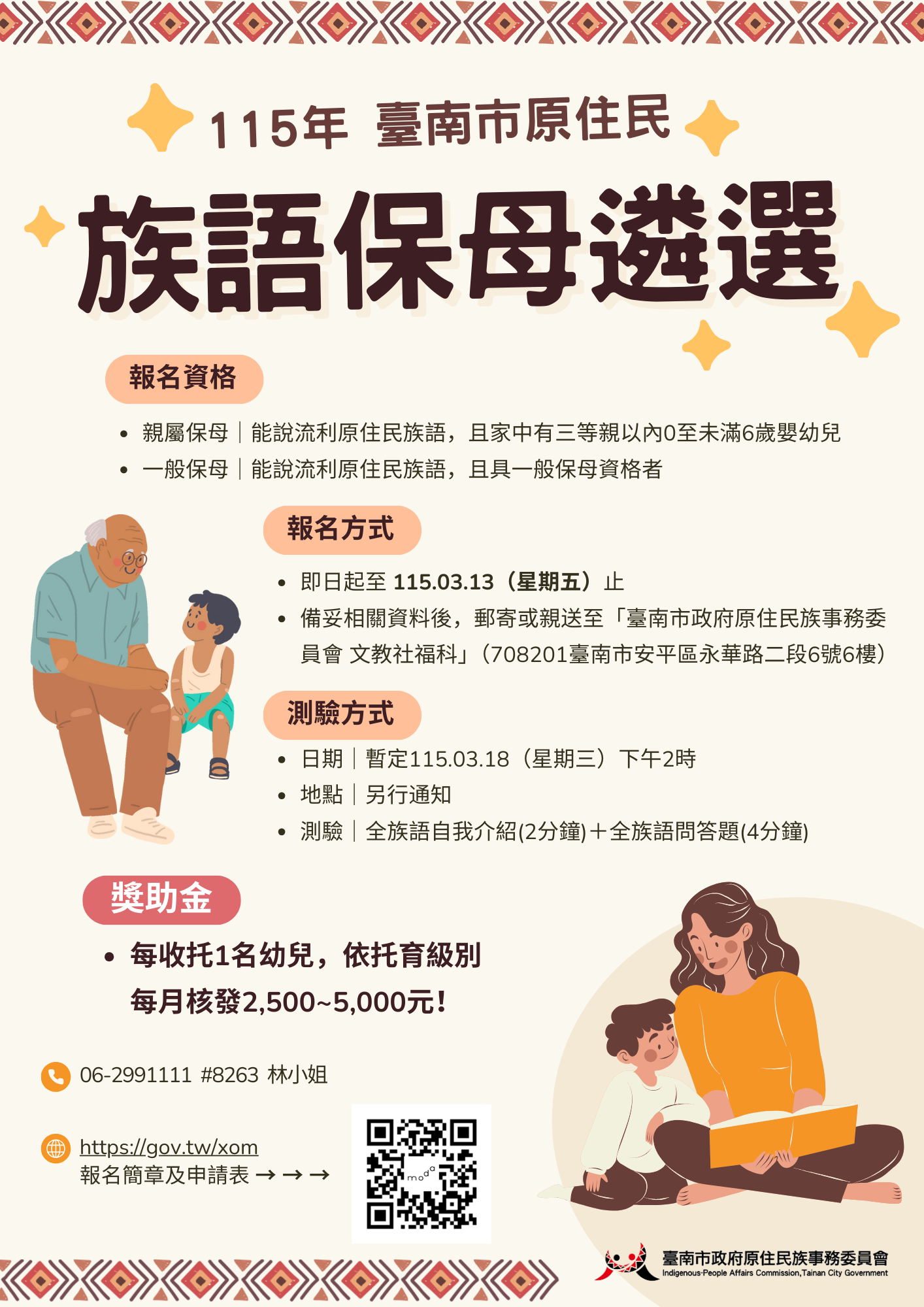 臺南市政府誠摯邀請您加入「族語保母」行列,一起打造孩子的母語環境🌱👶 ✨報名資格: ✅ 親屬保母:須能說流利原住民族語,且家中有三等親以內0歲以上未滿6歲未進入幼兒園及日間托育(嬰)中心之原住民嬰幼兒 ✅ 一般保母:能說流利原住民族語,且具一般保母資格者 ✅ 已進入幼兒 ...更多