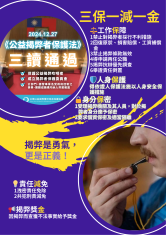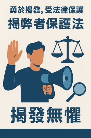 公益揭弊者保護法已於民國114年7月22日正式施行,旨在保護泛公部門的揭弊者,並提供「3保1減1金」措施,包括工作權保障、身分保密、人身安全保護、責任減免及揭弊獎金。此專法透過建立安心的吹哨環境,鼓勵民眾揭發不法行為,共同維護公共利益。