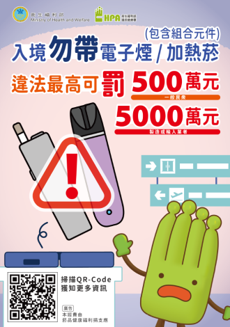 依菸害防制法第15條第1項第3款及同條第2項規定,任何人不得輸入電子煙或未經核定通過健康風險評估審查之指定菸品(加熱菸)及其必要之組合元件。目前尚無經衛生福利部核定通過之指定菸品及其必要組合元件,違法輸入之業者最高可處新臺幣5千萬元罰鍰,旅客攜帶加熱菸入境者處新臺幣5萬元至500萬元罰鍰。