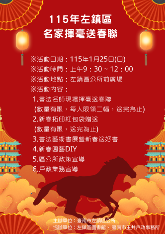 ※活動日期:115年1月25日(日)※活動時間:上午9:30 ~ 12:00※活動地點:左鎮區公所前廣場※活動內容: 1.書法名師現場揮毫送春聯 (數量有限,每人限領二幅,送完為止) 2.新春拓印紅包袋贈送 (數量有限,送完為止) 3.書法藝術書展暨新春送好書 4.新春園藝DIY 5.區公所政策宣導 6.戶政業務宣導主辦單位:臺南市左鎮區公所 協辦單位:左鎮區圖書館、臺南市玉井戶政事務所