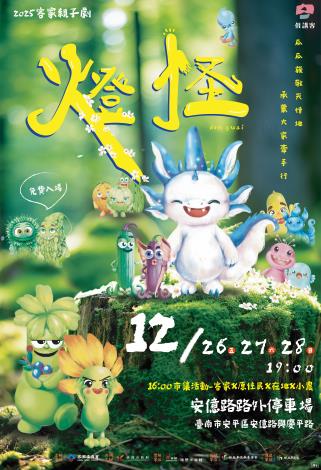 (一)時間:114年12月26日(星期五)、27日(星期六)、28日(星期日),每日下午7時,共3場次,免費入場。(二)地點:安平區安億路路外停車場(安億路與慶平路)(三)市集活動每日下午4時至9時。(客家原住民在地小農市集)劇情介紹:頭擺頭擺,瓜瓜島靠「燈族」照亮全島,毋過竻瓜仔因為阿爸海上任務遇難,下後盡惱燈怪。㇐直到今年迎燈大會,㇐隻黏人个細燈怪㇐路跈等佢,兩儕嗄分狂風吹落海底,意外發現「海底燈堡」个驚天秘密。|主辦單位|客家委員會、臺南市政府|演出單位|紙風車劇團