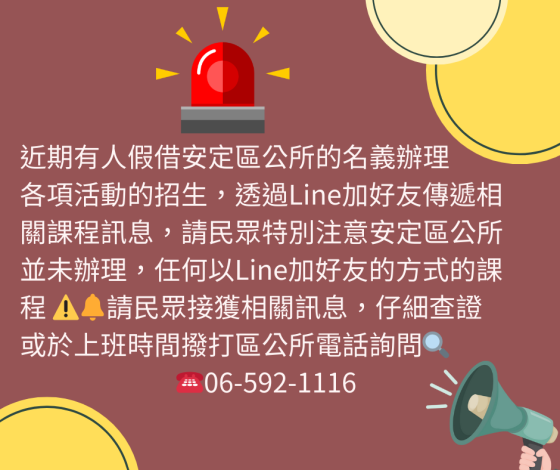 近期有人假借安定區公所的名義辦理各項活動的招生,透過Line加好友傳遞相關課程訊息,請民眾特別注意安定區公所並未辦理,任何以Line加好友的方式的課程。 ⚠️🔔請民眾接獲相關訊息,仔細查證或於上班時間撥打區公所電話06-5921116詢問。 ☎️🔍