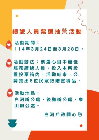 114年3月24日至114年3月28日止,民眾至本所各辦公處洽公時,由服務台人員或同仁發給民眾選票,選填心目中最佳服務禮貌人員後,投入本所設置之投票箱內。活動結束後,公開抽出6位投票民眾致贈宣導品。#得獎人至本所領獎,不得將獎項販賣或轉讓予他人,不得兌換現金或其他物品。#本所保有活動最後舉辦、修改、認定資格之權利,本活動如發生任何爭議,本所保有最後決定及解釋之權利。