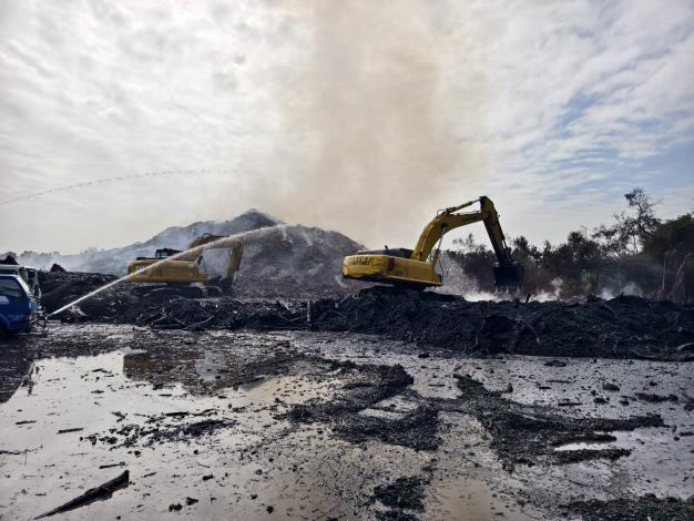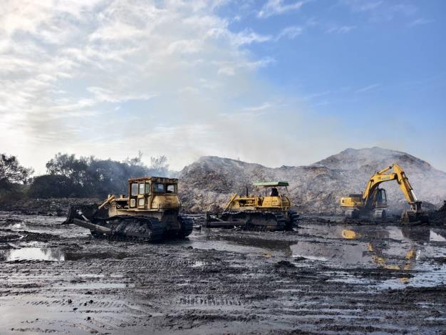 後壁區烏樹林風災廢棄物暫置場火警持續處理中,現場廢樹枝區經日夜不間斷地進行翻堆、灑水降溫及移置作業,28日已撲滅火勢,29日開始集中機具人力投入混合區撲滅工作。