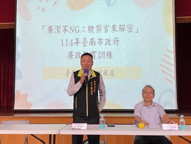 為提升公務同仁對廉政風險的辨識與因應能力,臺南市政府政風處於114年6月9日假新營區公所辦理「廉潔不NG:檢察官來解密」溪北場次廉政教育訓練,邀請屏東地檢署主任檢察官蔡佰達授課,針對同仁執行業務時可能面臨的廉政情境,進行法規說明與案例分析,強化第一線人員的廉潔意識與專業判斷力。