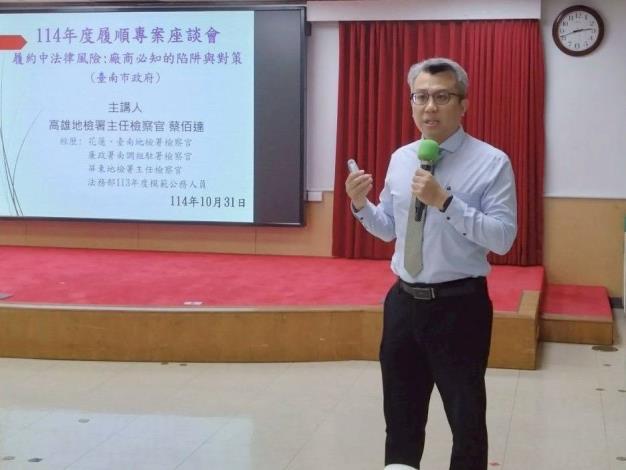 臺南市政府為加強履約廠商與機關之合作,確保誠信履約,提升採購效益,臺南市政府政風處今(31)日於永華市政中心舉辦「履順專案-安心履約廉政座談會」,邀集環境清潔、疏浚等勞務採購廠商及業務相關承辦人員參與,本次座談以AI科技導入查核及履約管理為核心,運用智慧監測與數據分析,協助機關及廠商提早發現潛在問題、即時改善缺失,展現臺南市政府推動智慧廉政與高效治理的決心,現場氣氛熱絡,互動熱烈。