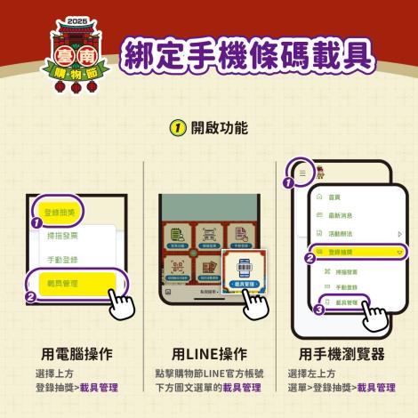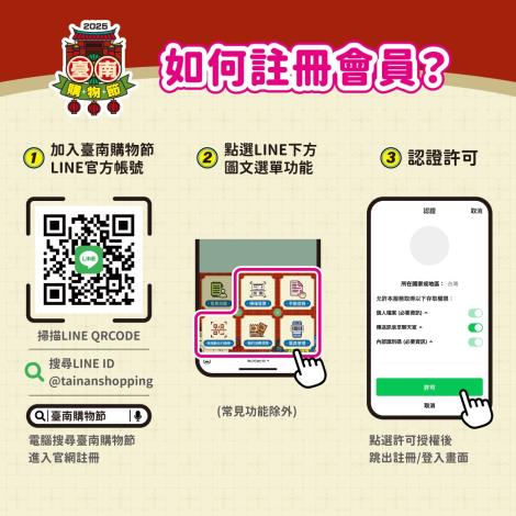 2025年臺南購物節活動持續到明年3月1日,只要在臺南消費不限金額登錄,消費滿50元就可獲得抽獎序號,獎項包括百萬電動車、3C實用家電、飯店住宿券等好禮,現金獎更是全面升級,月月抽8萬元,壓軸再抽現金88萬元!12月起更加碼推出「週週抽」,每週二抽出智慧電車與現金獎等總價值逾10萬元的獎項,驚喜連連。立即加入「2025臺南購物節」官方LINE 帳號,輕鬆完成消費登錄,來臺南旅遊GO購,買越多、抽越多,好禮大獎等你帶回家!