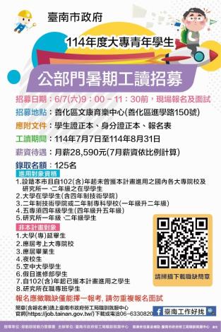 臺南市政府勞工局於6月7日(六)上午9點至11點30分在善化區文康育樂中心(臺南市善化區進學路150號)辦理「114年度大專青年學生公部門暑期工讀計畫」招募活動,提供125個工讀機會,當日辦理現場報名及公開面試,歡迎設籍臺南市之大專院校以上在學學生踴躍報名參加,面試當天於善化火車站前提供免費接駁專車往返於活動會場,請求職民眾多加利用,相關問題詳洽:06-6330820。