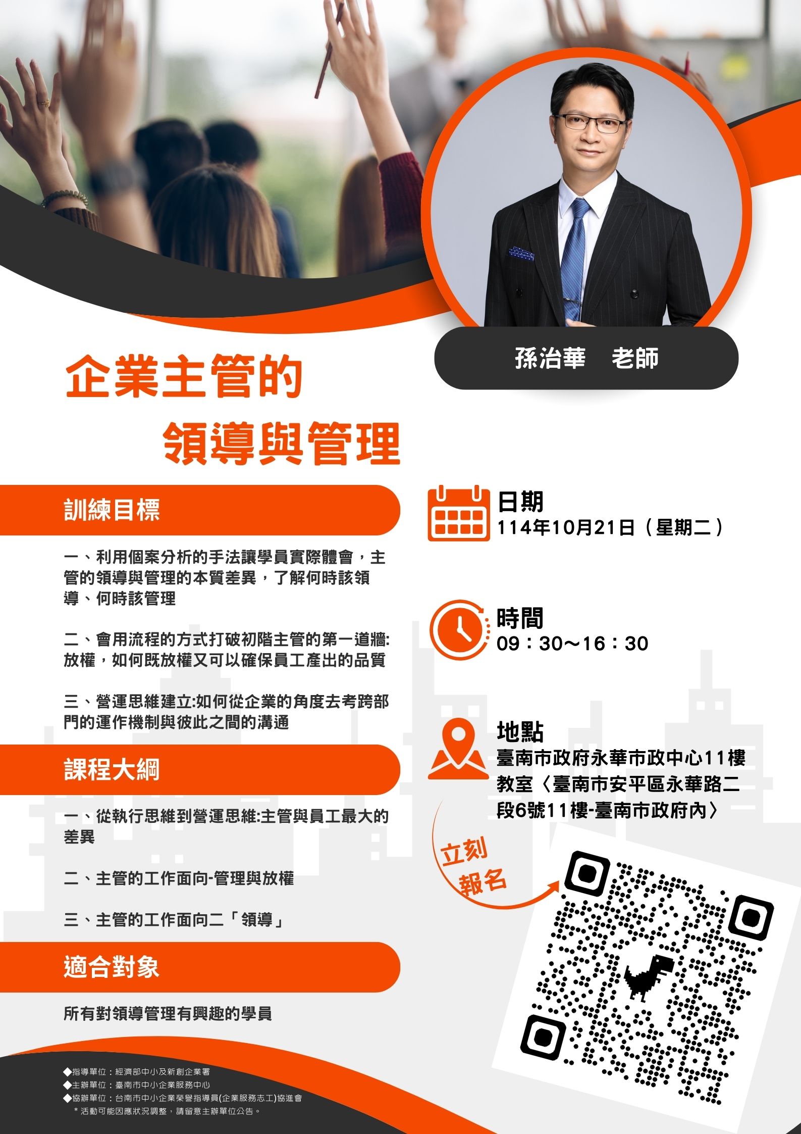 公告日期:114-09-22~119-09-22活動時間:251021-企業主管的領導與管理 - 114-10-21 09:30 ~ 114-10-21 16:30