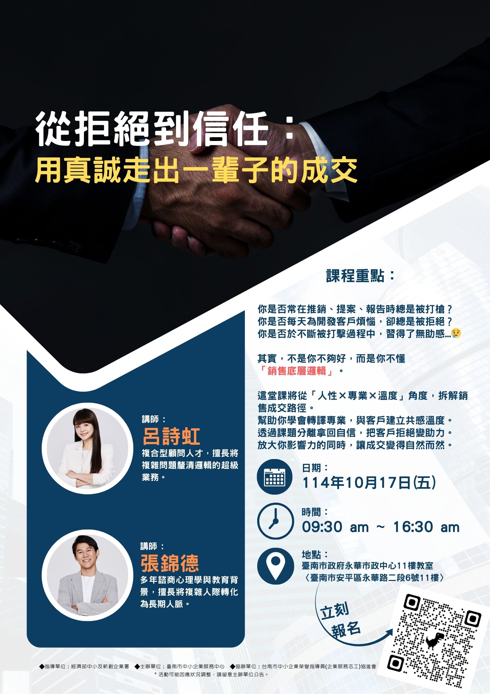 公告日期:114-09-12~119-10-17活動時間:251017-【從拒絕到信任:用真誠走出一輩子的成交】 - 114-09-12 09:30 ~ 114-10-17 16:30