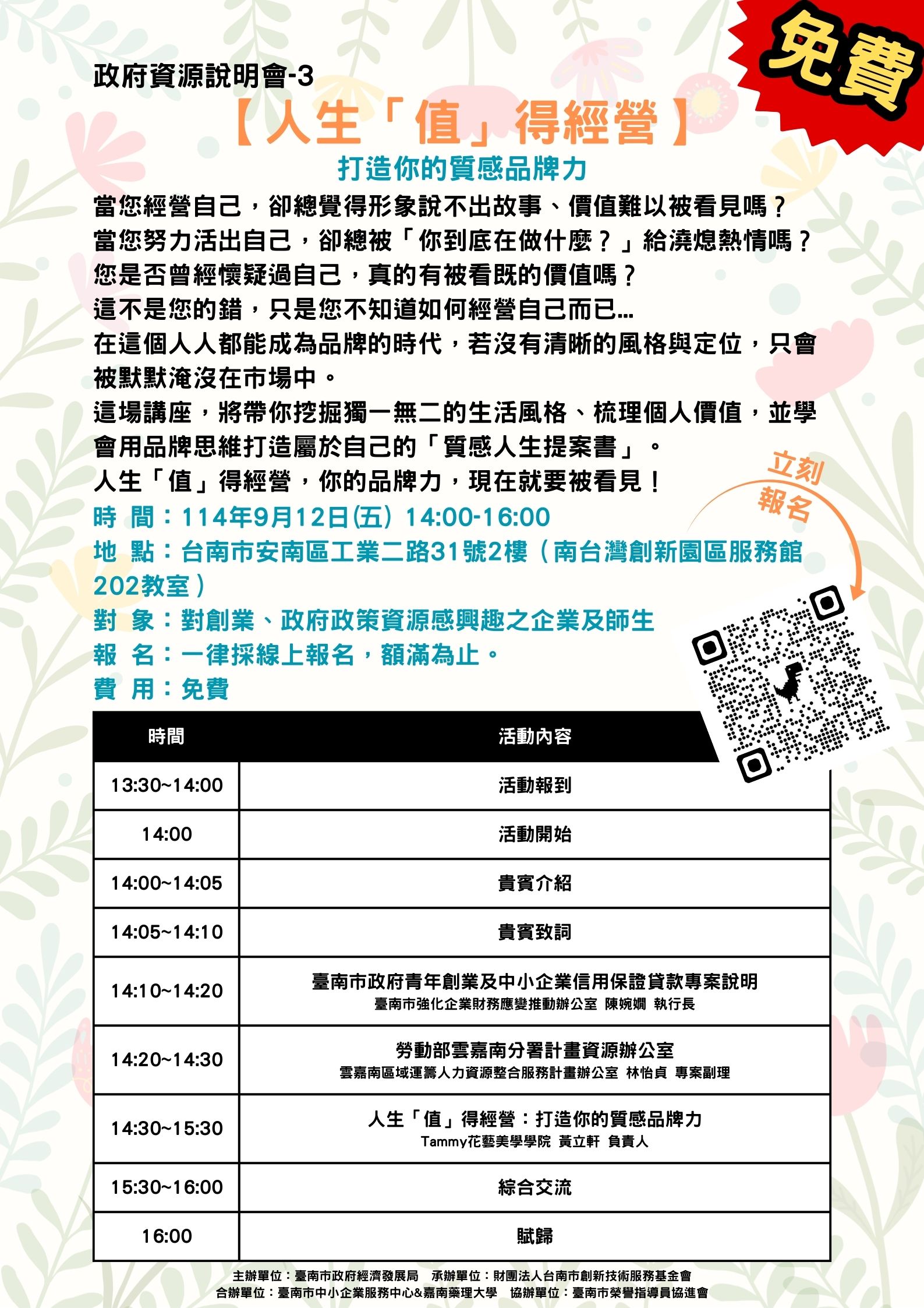 公告日期:114-05-20~119-09-12活動時間:250912-【人生「值」得經營】 - 114-09-12 14:00 ~ 114-09-12 16:00