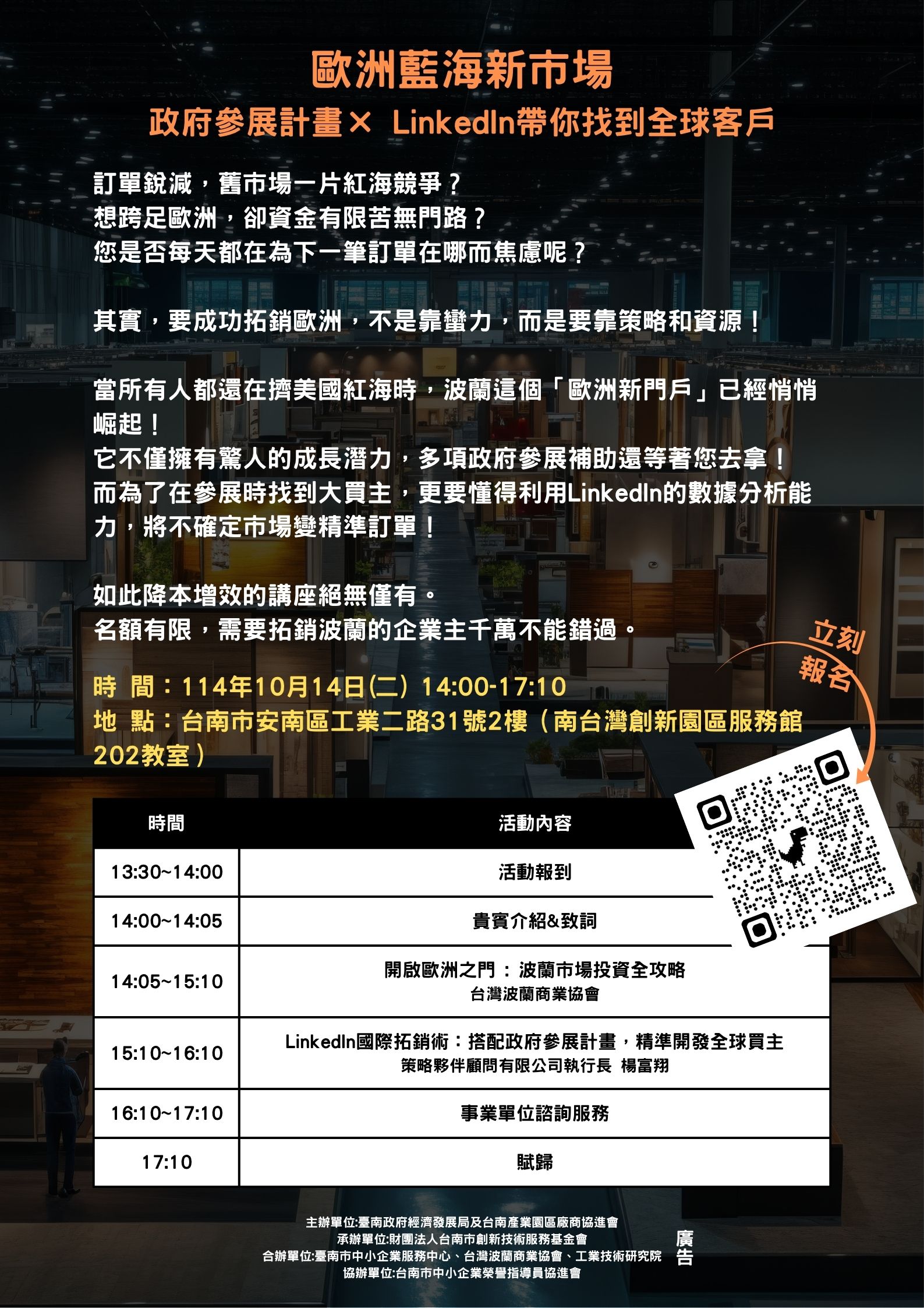 公告日期:114-10-03~119-10-14活動時間:251014-【歐洲藍海新市場:政府參展計畫 × LinkedIn帶你找到全球客戶】 - 114-10-14 14:00 ~ 114-10-14 17:00