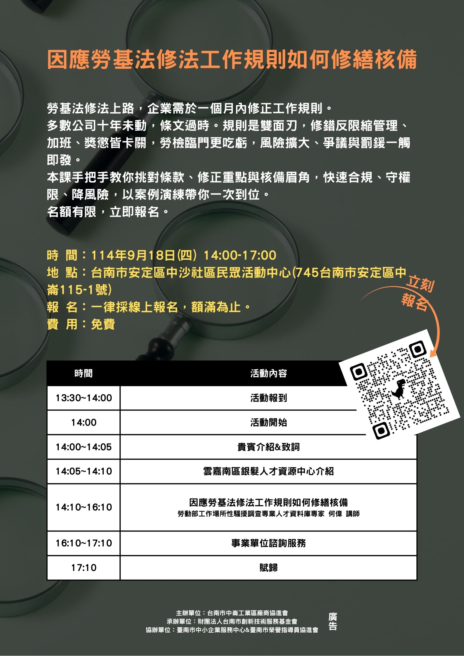 公告日期:114-09-05~119-09-18活動時間:250918-【因應勞基法修法工作規則如何修繕核備】 - 114-09-18 14:00 ~ 114-09-18 17:00