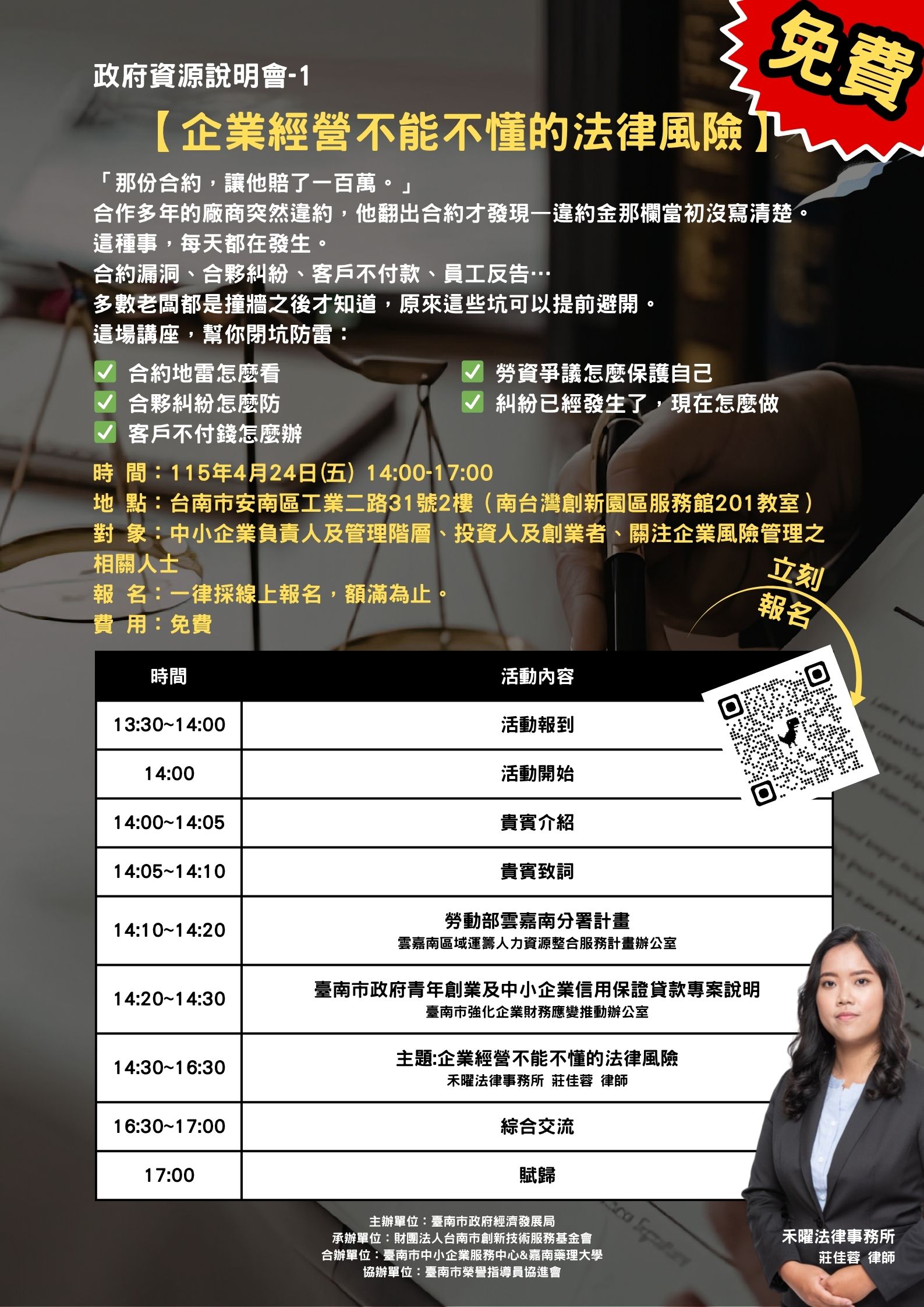 公告日期:115-04-01~119-04-24活動時間:260424-【企業經營不能不懂的法律風險】 - 115-04-24 14:00 ~ 115-04-24 17:00