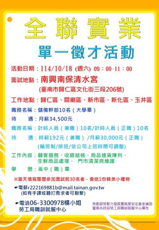 114/10/18(六)勞工局職訓就服中心辦理「全聯實業股份有限公司」單一徵才活動,歡迎求職民眾踴躍參加
