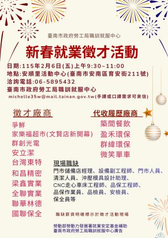 為打造黃偉哲市長「希望家園」的施政願景,勞工局積極辦理各項就業徵才活動,並因應產業求才需求,勞工局職訓就服中心將於2月6日(週五)上午9點30分至11點在安順里活動中心辦理新春就業小型徵才活動(臺南市安南區安南區育安街211號),共邀請14家廠商提供超過500個職缺,歡迎求職民眾踴躍前往參加,洽詢電話:06-5895432。