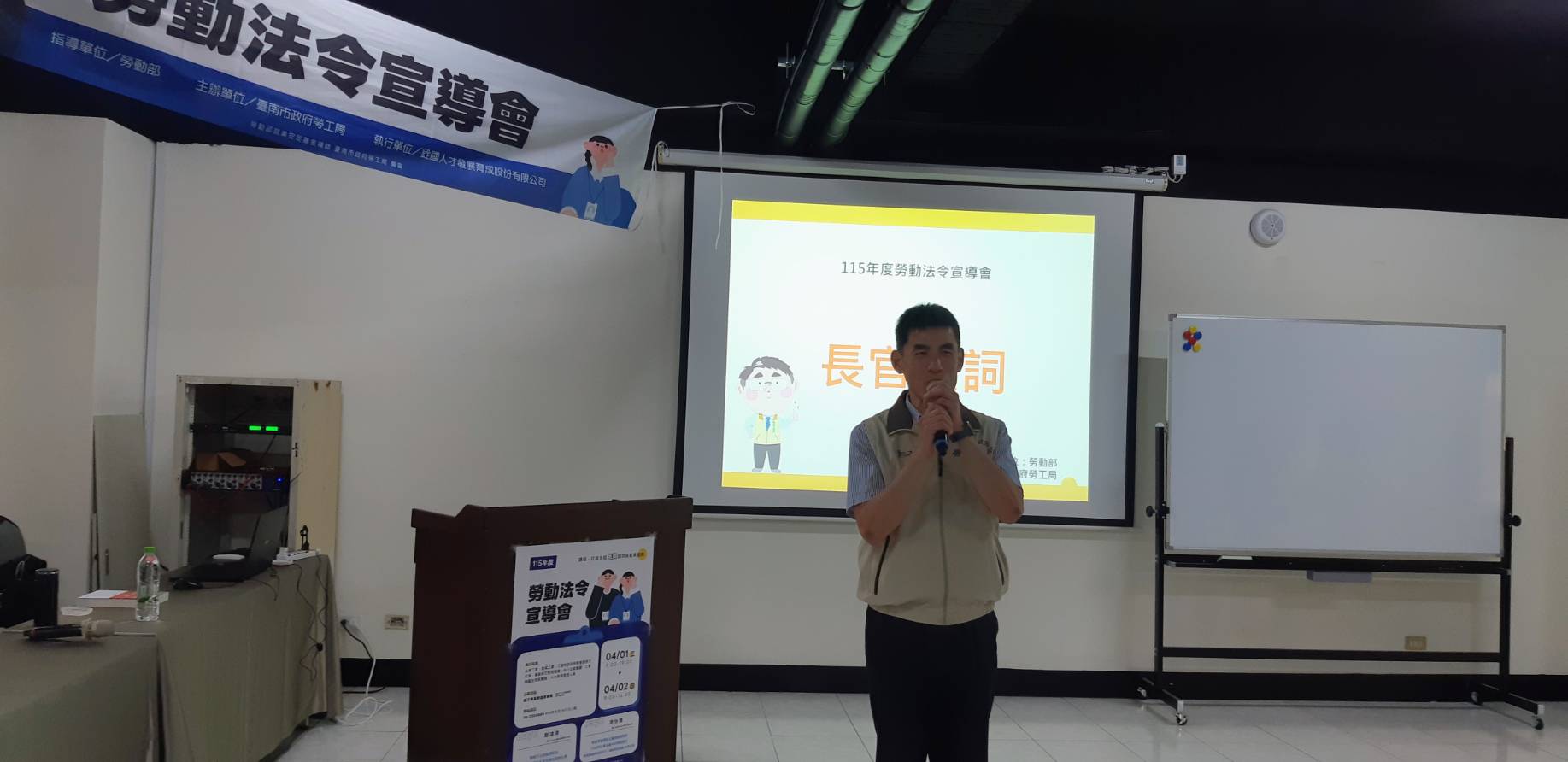 為強化事業單位勞動法令遵循意識並保障勞工權益,臺南市政府勞工局將辦理10場次「勞動法令宣導會」,每場次開放60個名額,今(1)日首場登場,報名情形踴躍,吸引眾多事業單位負責人、人資管理人員及勞資會議代表到場參與,現場互動熱絡。 勞工局王鑫基局長表示,隨著勞動法令日趨周延,事業 ...更多