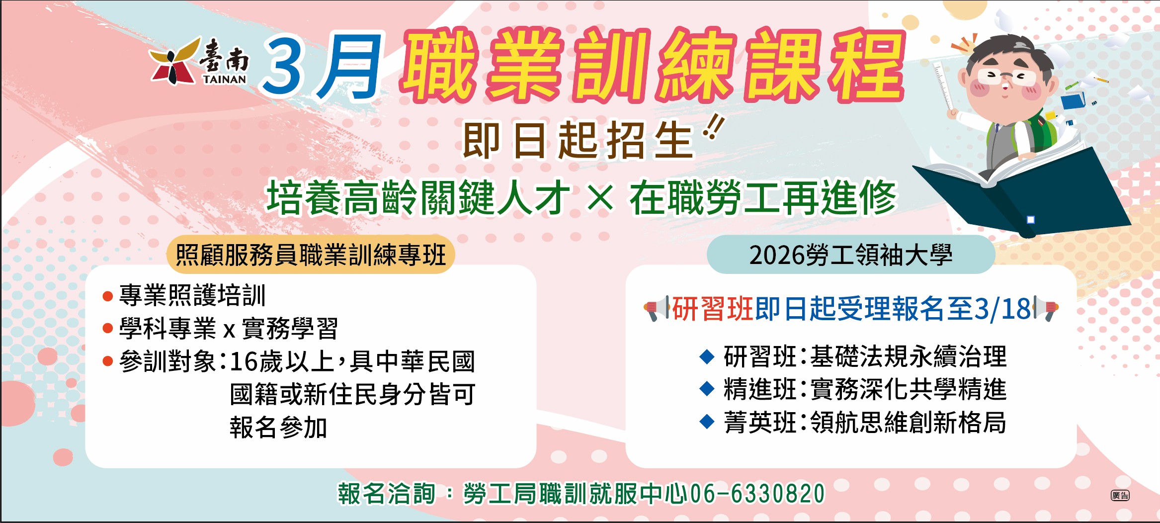 為強化勞工團體、工會組織及企業幹部之領導素養與管理能力,以及培育在地照護專業人力,臺南市政府勞工局持續推動多元人才培育課程,致力建構臺南成為培育人才的「希望家園」。 勞工局長王鑫基表示,勞工局與國立成功大學合辦的「勞工領袖大學」階梯式學習課程邁入第16年,辦訓成效有口皆碑。為持續改善 ...更多