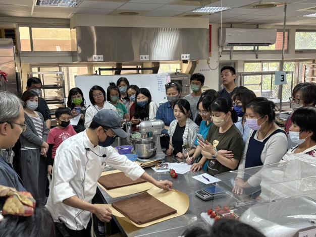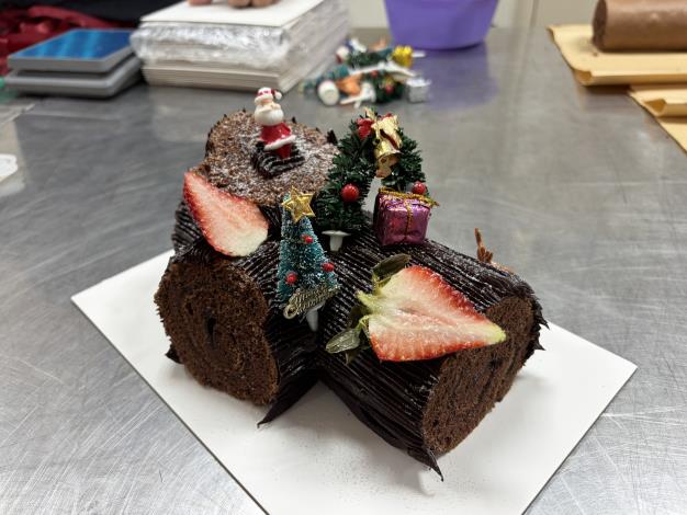 本次課程由資深烘焙講師蔡銘老師授課。蔡老師曾任高雄五星級飯店點心房主廚,現為社團法人臺南市觀光協會專任職訓講師,並於南部多所大專院校教授烘焙課程,深耕產業逾二十年,擁有豐富實務經驗與專業技術。課程中,蔡老師分享「聖誕樹幹蛋糕」的由來:在歐洲早期以柴火過冬的年代,人們會於冬至夜由家中最年長者與最年幼者共同點燃壁爐裡的柴薪,並灑上葡萄酒、牛奶與聖水,象徵驅散黑暗、迎向光明與豐收。後來,拜訪親友時攜帶好柴薪贈送主人的習俗,便演變為今日聖誕節製作與分享樹幹蛋糕的傳統。本課程除讓學員了解節慶甜點的文化背景,也透過親手製作,將心意與創意融入作品中,現場氣氛溫馨熱絡。