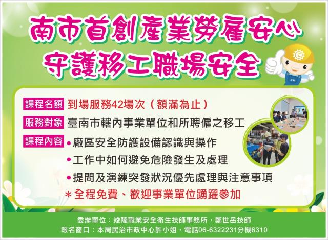 勞工局指出,114年產業類勞雇安心計畫即日起開放報名,服務全程免費。凡在臺南市轄內聘有移工之事業單位皆可提出申請。透過本計畫,不僅提升移工職安意識,也有助於企業打造更有韌性的工作環境。相關報名資訊可洽臺南市政府勞工局06-6322231分機6310許小姐,歡迎踴躍參與,共同打造安全有愛的臺南「希望家園」。