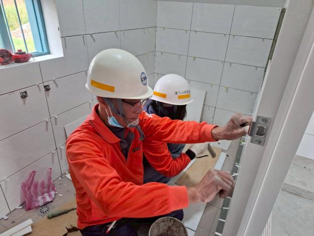 鹽水區陳姓案主房屋因今年7月丹娜絲風災來襲而嚴重受損,加上家庭經濟狀況不穩,無力負擔高額修繕費用。做工行善團接獲通報後,於10月31日前往現場會勘,並迅速規劃後續修繕期程。前期包含斷電、拆除及管線配置等作業皆已完成,室內裝潢工程亦於上週順利完工。昨日(12/27)油漆工會先前往鹽水區進行防水工程,今由泥水工會志工進行壁磚施作,完成牆面磁磚工程,讓案主距離重返溫馨家園的目標再近一步。
