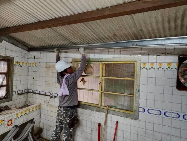官田區個案為41年次的陳女士,為丹娜絲颱風的受災户。喪偶與兒子同住,兒子身體狀況不佳,只能打零工賺取微薄收入。陳女士每月領取中低收老人生活津貼約4,000多元。目前居住之房屋屋頂、廚房受損,因經濟困難,無力負擔房屋修繕費用。勞工局接獲通報後,經做工行善團場勘隨即展開修繕工程: 泥水工會拆除屋內天花板,當日官田區長洪聰發親自前來案家帶飲料慰勞志工。今日電子加工工會接力,進行水槽水、水切施作;泥水工會進行屋瓦修繕、防水施作,官田區公所團隊也帶飲品到場為志工打氣,大家不計辛勞的付出為社會公益貢獻真誠,讓原本破舊的房屋重現新貌,為弱勢家庭打造安心居住的家園。