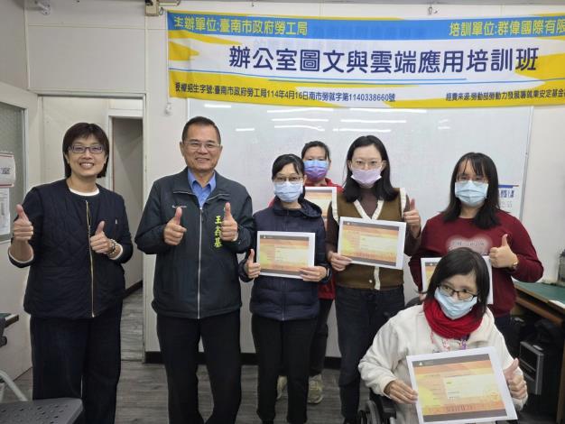 臺南市政府勞工局為推動市長黃偉哲「希望家園」施政理念,委託群偉國際有限公司辦理「114年度電腦資訊類身心障礙者職業訓練-辦公室圖文與雲端應用培訓班」,於今(30)日結訓,18位結訓學員喜迎未來盼成為新時代辦公室達人。