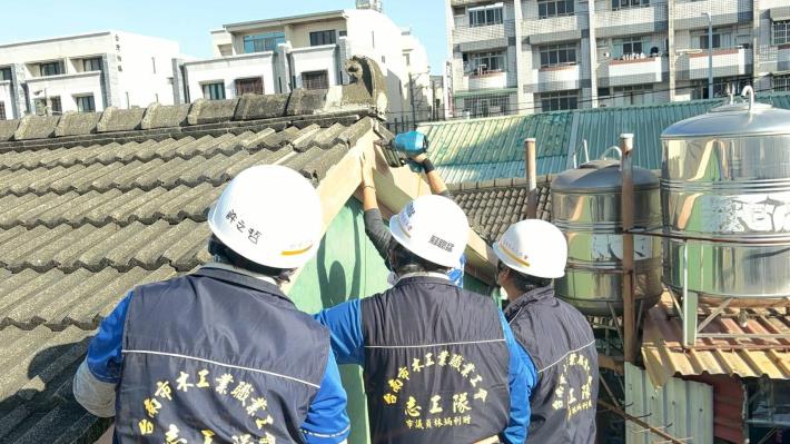 官田區本次服務對象為41年次的陳女士,因丹娜絲颱風造成住家受損,屋頂及廚房多處破壞。陳女士每月僅仰賴約4,000多元的中低收入老人生活津貼維生,面對高額修繕費用實屬無力負擔。勞工局在接獲通報後,立即媒合做工行善團投入協助,展開分工修繕行動。今日由臺南市木工業職業工會及電氣業職業工會接力進場,進行室內裝潢、電線配置及熱水器安裝等工程。先前則已由泥水業職業工會完成天花板拆除、屋瓦修繕與防水施作,電子機械加工職業工會亦協助水槽與排水工程。後續將由油漆工程業職業工會接棒,為陳女士的住家進行最後美化,逐步完成安全、舒適的居住空間。