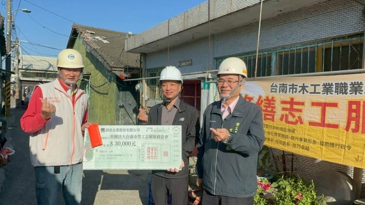 為落實臺南市長黃偉哲「希望家園」的施政理念,臺南市政府勞工局持續結合「做工行善團」修繕志工,運用專業技能與假日時間,主動走入社區,為弱勢家庭改善居住環境。今日修繕行動同步前往官田區與麻豆區,官田區公所送飲料慰勞志工們的溫暖付出,亦讓受助家庭備感窩心與感動。另訊亞企業股份有限公司附設職業訓練中心辦理職訓課程成果展,也將義賣所得捐給做工行善團作為材料費用響應公益,社團法人台南市志願服務協會梁志男理事長代表受贈及致送感謝狀,也帶飲品慰勞為志工加油打氣。