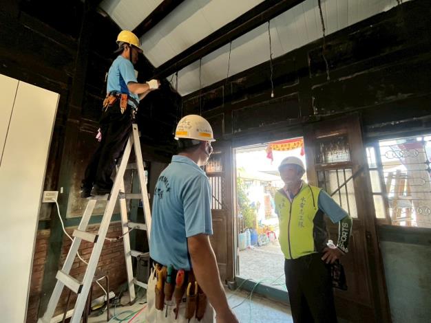 另居住於後壁區菁寮後廍黃女士,高齡80多歲,目前獨自一人居住,具低收入戶資格,平時做資源回收貼補家用。因丹娜絲颱風影響,老舊房屋嚴重受損,案主無力進行修繕,做工行善團接獲通報,便啟動修繕機制進行會勘,並於今日由電氣工會率先進場,進行斷電及移除廢棄電線作業。