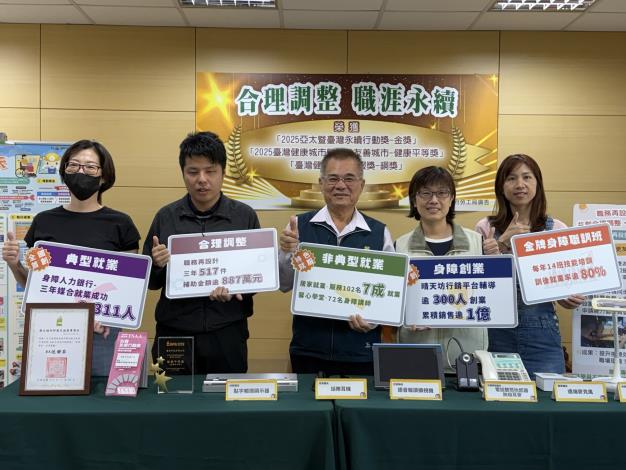 臺南市政府勞工局長期致力提升身心障礙者就業並推動職場共融,努力深受肯定,今年同時榮獲「2025亞太暨臺灣永續行動獎-金獎」、「2025臺灣健康城市暨高齡友善城市-健康平等獎」以及「臺灣健康城市海報獎-銅獎」三大獎項。除積極落實聯合國《身心障礙者權利公約(CRPD)》核心精神並展現卓越成果外,亦展現黃偉哲市長打造臺南成為「希望家園」的施政願景。