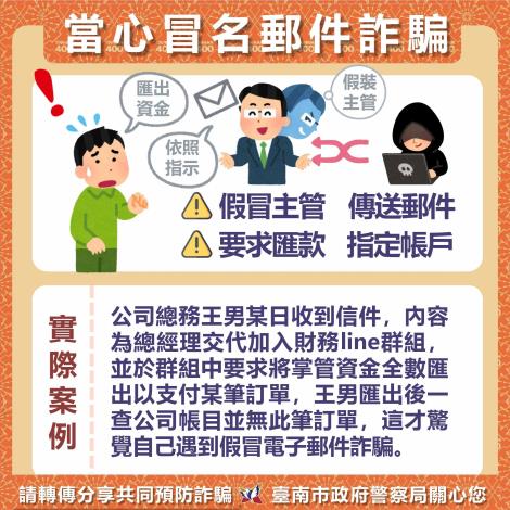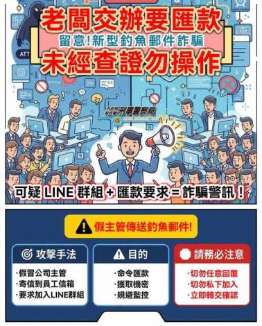 為避免有詐騙集團以假冒公司主管或合作廠商名義傳送釣魚郵件,信件中並以立即 支付貨款、要求變更往來帳戶等理由,要求員工加入特定 Line群組,或直接依指示將公司資金匯款至指定帳戶進行詐騙,造成大額財務損失。因此類偽冒商務電子詐騙手法,本局針對轄管產業工會及市民勞工朋友協助加強宣導,本局透過業務管道廣為宣導周知,再一次提醒勞工民眾收到要求匯款資訊 應先詳予查證及確認,以避免遭詐受損。