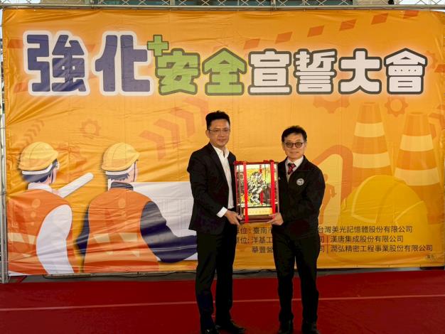 為強化春節前後職場安全監督效能,降低災害發生,南市勞工局今日(1/14) 和經濟部產業園區管理局臺南分局、台灣美光記憶體股份有限公司台南一廠,攜手美光專案相關承攬廠商,於洋基工程美光專案聯合辦公室舉辦「強化安全宣誓大會」,透過跨界合作,促使各承攬廠商強化自主安全管理機制,落實作業前危害辨識、施工環境巡檢、設備檢點及人員安全教育訓練,全面檢視並加強春節前各項安全規範,預防職災發生。