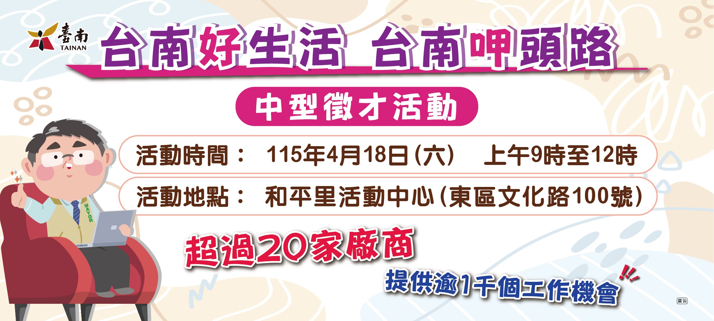 為打造「希望家園」的施政願景,勞工局今(115)年第1場「台南好生活 台南呷頭路」中型徵才活動將於4月18日(週六)上午9時至12時在東區和平里活動中心辦理,有台灣矽科宏晟科技、台灣穗高科技、小北百貨、官田鋼鐵、全家便利商店、臺南紡織、興南汽車客運、統聯汽車客運、台灣東特、東信輕金屬、榮眾科技、全聯 ...更多
