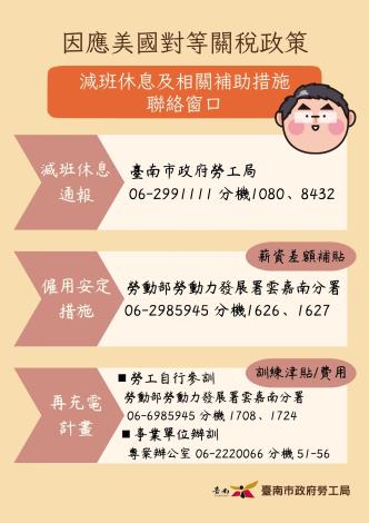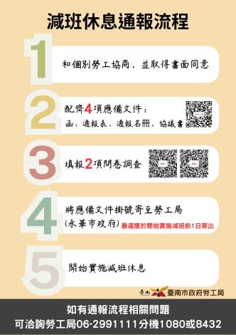 ※若有減班休息「通報流程」的相關問題,可洽本局勞動條件科承辦窗口(06-2991111#1080、#8432)