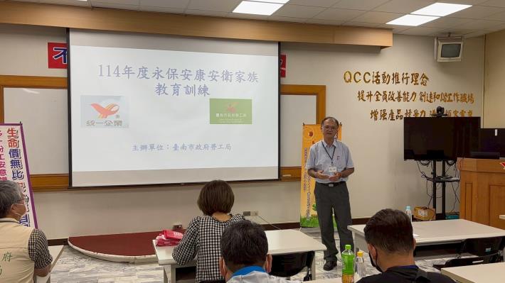 本次永保安康安衛家族教育訓練課程內容豐富,上午場由南區職業安全衛生中心張瑋淯檢查員講授「勞動檢查實務分享」,透過實務案例說明局限空間作業的危害類型及預防措施,並進一步就「職場不法侵害預防」議題,說明不法侵害的類型、雇主應依《執行職務遭受不法侵害預防指引》(第四版)等相關法令規劃之預防機制,強調建立制度與法律責任相輔相成的重要性,以強化職場保護機制,讓勞工安心投入工作。下午課程則由嘉南藥理大學退休教授鄭世岳所率領的技師團隊,深入講授「職場健康衛生」相關主題,內容涵蓋人因工程設計、異常工作負荷管理、母性保護及不法侵害預防等實務議題,協助事業單位建立完整的健康管理制度與友善職場文化。