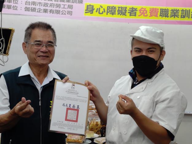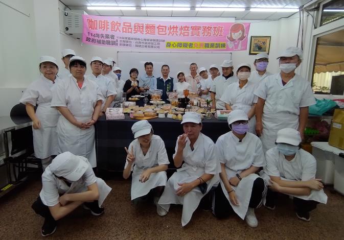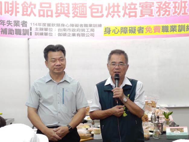 臺南市政府勞工局在市長黃偉哲「希望家園」的朔造之下,委託伽碩企業有限公司辦理「咖啡飲品與麵包烘焙實務班」身障職訓班,在課程尾聲舉辦成果義賣,現場擺放學員親手製作的烘焙成品,並將成果義賣全數捐出。