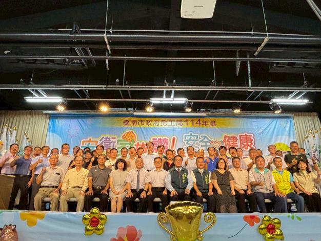 秉持偉哲市長「做得更好、過得更好」的理念,啟動希望家園守護職場安全健康,市府勞工局今日(9/12)於關子嶺勞工育樂中心舉辦2025「安衛家族讚!安全健康Number One」安衛家族大會師、職安優良單位及人員表揚暨高階主管論壇,大會師活動重頭戲由市長授旗與四十一個安衛家族,並頒發勞動部推行職業安全衛生優良單位及人員、本市績效卓越安衛家族等獎項,與會貴賓立委陳亭妃服務處陳金村秘書、立委林俊憲服務處劉朝仁特助、立委賴惠員服務處籃鳳釵秘書、議員蔡育暉服務處林立永秘書、議員沈家鳳服務處徐朝陽特助、議員李宗翰服務處吳昕璨助理、台南市總工會林慶文常務理事、大台南總工會林子紘常務理事、台南市產業總工會林再亨理事長、經濟部產業園區管理局台南分局曹家文分局長、經濟部新營產業園區服務中心楊芳茂主任、經濟部官田產業園區服務中心郭幸男主任、經濟部永康產業園區服務中心郭庚源主任、經濟部台南產業園區服務中心李宗燦主任、官田廠商協進會季惠卿理事長、永康廠商協進會吳淑芬總幹事等蒞臨會場,共同表達對市府推動職業安全衛生的認同與肯定。