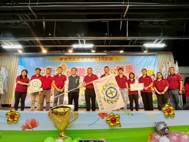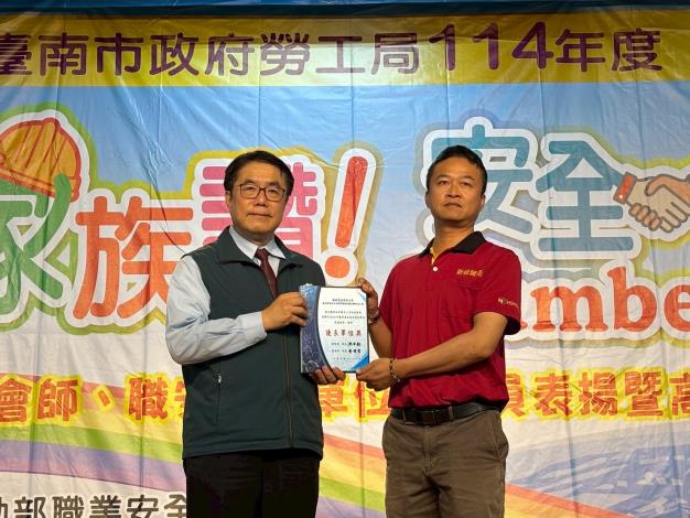他也提到市府積極推動安衛家族績效卓著,勞工局迄今已成立四十一個安衛家族「大廠帶小廠」,超過千家事業單位參與運作,提升本市職業安全衛生文化。本次活動公開表揚榮獲勞動部職安優良單位獎項的企業,皆為本市安衛家族成員,其中包括信鼎技術服務股份有限公司臺南市城西垃圾焚化廠、臺灣菸酒股份有限公司善化啤酒廠、達和環保服務股份有限公司臺南市永康垃圾資源回收(焚化)廠、新舜營造有限公司(臺南都會區北外環銜接樹谷園區聯絡道工程)、芳泉工業股份有限公司新營廠獲頒勞動部推行職業安全衛生優良單位,統一企業股份有限公司冰品廠葉依彩、台灣中油股份有限公司天然氣事業部南區營業處陳沛穎、奇美醫療財團法人奇美醫院劉懷璟獲選全國職安優良人員功績獎。偉哲市長恭喜今年度推行職業安全衛生獲獎事業單位及優良人員,他感謝本市各事業單位在職場安全及衛生推動的努力,也呼籲各界共同推動職場健康、落實職安,確保企業持續營運、保障勞工健康安全。