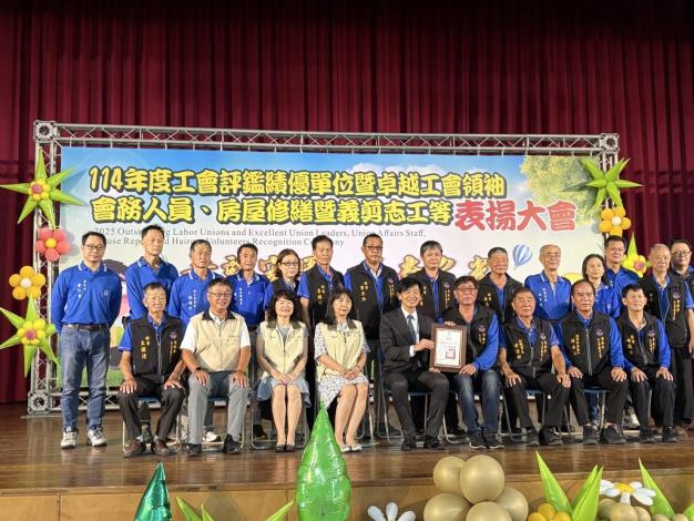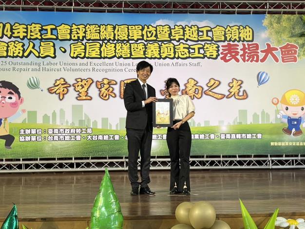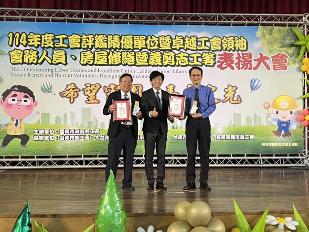 勞工局今(3)日在善化文康育樂中心舉行「114年度工會評鑑績優單位暨卓越工會領袖、會務人員、房屋修繕暨義剪志工等表揚活動大會活動」,葉澤山副市長首先頒發五心職場獲獎績優單位-台灣基督長老教會新樓醫療財團法人附設麻豆新樓醫院護理之家、森霸電力股份有限公司等2家並頒獎200家優等工會、88家甲等工會、11名卓越工會領袖、13名卓越會務人員、齊心參與做工行善團23家工會團體及669位房屋修繕與義剪志工們,都在職場上兢兢業業打拼,肯定勉勵同時表達感謝之意,期勉大家齊心打造「希望家園」施政願景,成為臺南的榮耀。