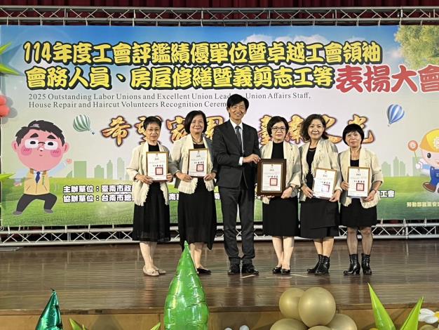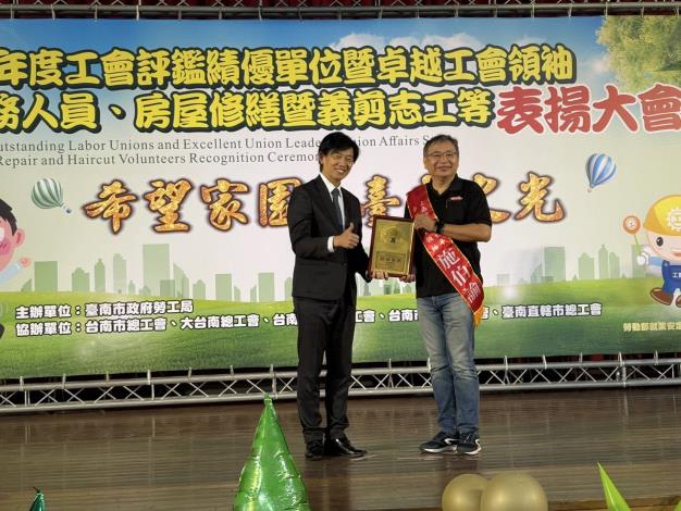 11位卓越工會領袖:台南市運動場所服務職業工會理事長謝惠娟、台灣百事食品股份有限公司工會理事長林麗娟、台南市佳大世界股份有限公司工會理事長洪慶堂、台南市機車修理業職業工會理事長施伯諭、大台南電器裝修職業工會理事長陳崇崑、台南市家具製造修理職業工會理事長陳萬枝、統一企業股份有限公司企業工會監事會召集人郭美淑、大台南舞蹈職業工會理事長黃千壹、台南市米食製品從業人員職業工會理事長王坪義、台南市油漆工程業職業工會監事會召集人王泰倫、台南市皮鞋業職業工會理事長方士祈等11名。