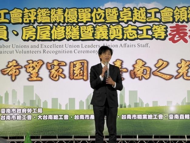 副市長肯定獲得評鑑優等、甲等工會的理、監事幹部及會務人員之辛勞,也恭喜得獎的卓越工會領袖暨會務人員,並勉勵修繕義剪志工伙伴們,分享台南溫暖的愛。他強調,建立良好的勞資關係並營造勞工朋友友善的就業職場,是市府施政的首要目標,勞工局將持續在勞資雙方中,擔任好溝通協調及公正第三者的角色,另外弱勢勞工家庭房屋修繕服務及義剪志工發揮所長,用愛心與實際行動相挺,善行值得嘉勉,一起共築臺南,讓臺南市成為「幸福、永續」有愛的城市。
