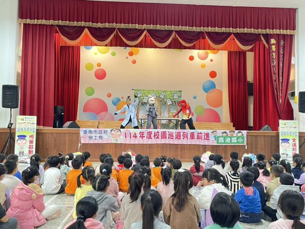 西港國小郭校長表示,很高興臺南市政府勞工局以及真藝術工作室帶來戲劇表演,欣賞表演向來是小學生們喜愛的活動,透過劇團展演傳達勞動概念,不但寓教於樂,會後還有提供有獎徵答互動,鼓勵小朋友們專心看劇並勇於發言,此機會極為難得。