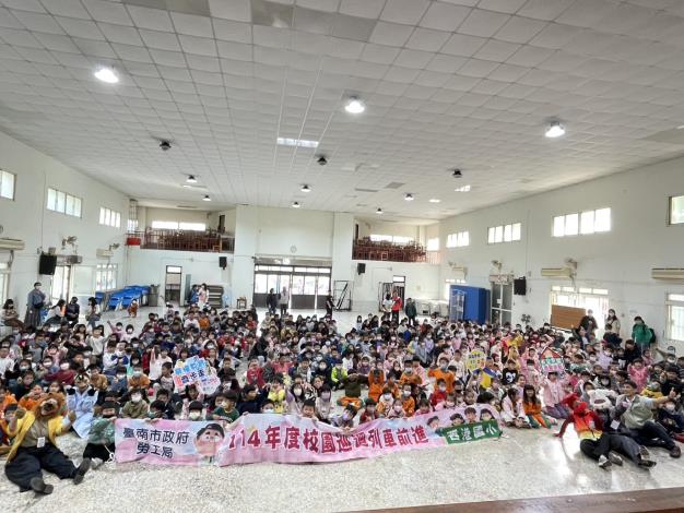 臺南市政府勞工局為能推動「落實勞權教育、勞動法令向下扎根」,今(26)日特別安排劇團前進西港國小演出「快樂森林工坊」戲劇,勞工局王鑫基局長、吳旻釗科長、西港國小郭國成校長及400多位師生一同欣賞劇團表演,劇團精彩的演出,吸引了小學生們的目光,現場互動熱絡,劇團演出後還進行有獎徵答,同學們踴躍參與。