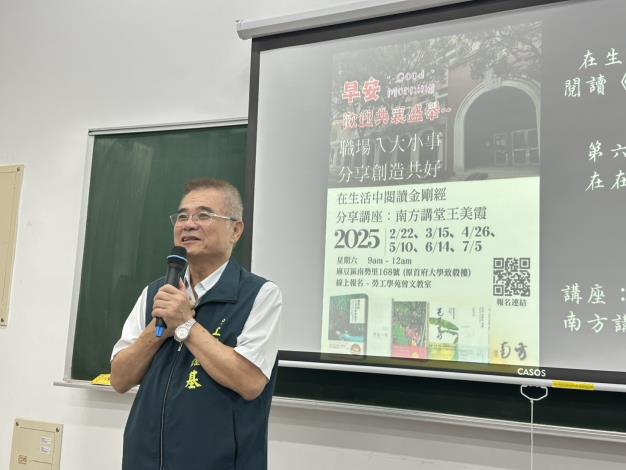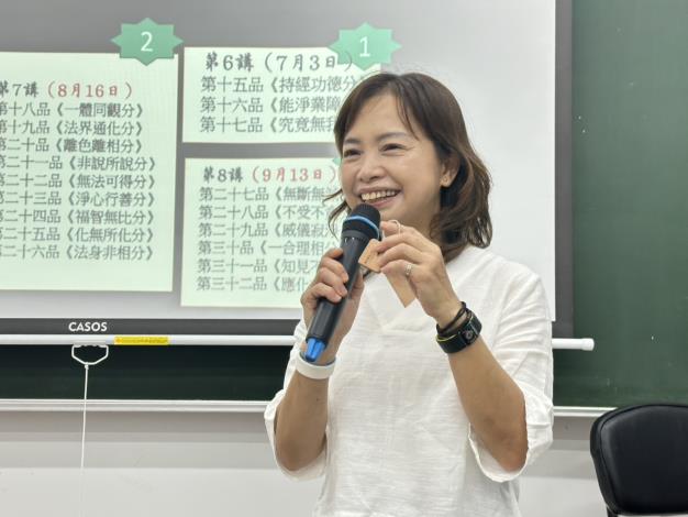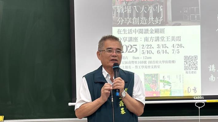 為營造臺南市良好的學習風氣、深化勞工教育,並充實市民的生活內涵與智慧,落實黃偉哲市長「希望家園」的施政願景,臺南市政府勞工局於麻豆曾文市政願景園區舉辦「職場ㄟ大小事,分享創造共好」系列講座,持續邀請南方講堂創辦人王美霞老師擔綱主講。本系列課程以「在生活中閱讀《金剛經》」為主題,已邁入第六堂課,與市民一同深入探索佛教經典的智慧,並引導學員思考如何將艱澀經文融入日常,實踐於待人處事之中,透過五感六識體驗生活之美。